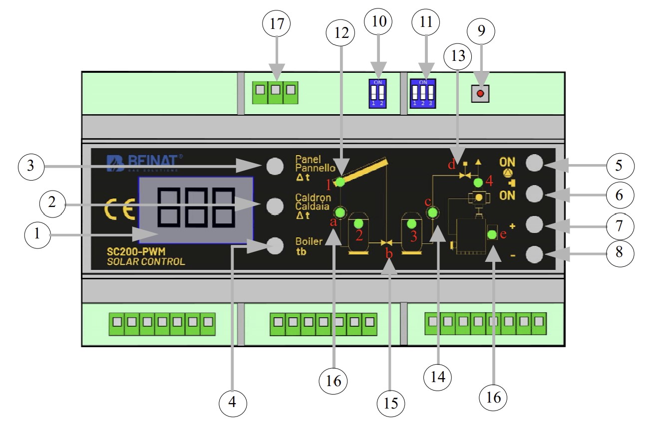 Bộ điều khiển Solar Control SC200-PWM là một thiết bị điện tử được chế tạo từ kinh nghiệm nhiều năm của BEINAT Srl trong lĩnh vực điều khiển nhiệt. Sử dụng các cảm biến được cung cấp, bộ điều khiển sẽ phát hiện nhiệt độ của nước trong nồi hơi lưu trữ và so sánh với nhiệt độ của chất lỏng trong các tấm pin mặt trời.Khi nhiệt độ của các tấm pin cao hơn nhiệt độ của nước nồi hơi, bộ điều khiển sẽ khởi động máy bơm, cho phép trao đổi nhiệt giữa bảng điều khiển và nồi hơi,, đồng thời với việc bổ sung bộ điều khiển xung điện, có thể giao tiếp qua 4-20 mA.