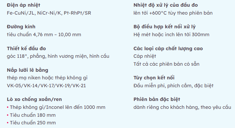 Thông số kỹ thuật cảm biến nhiệt điện lưỡi lê Graff