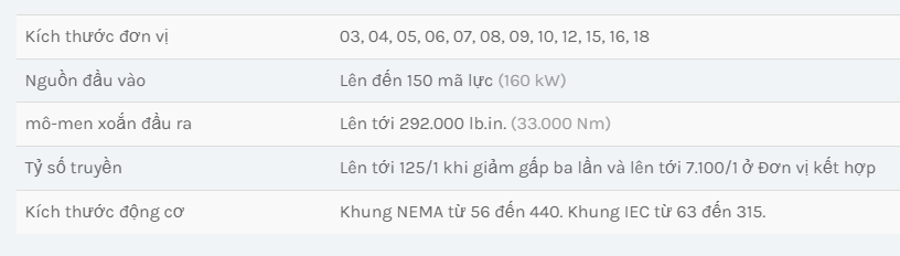 Thông số kỹ thuật động cơ bánh răng Radicon