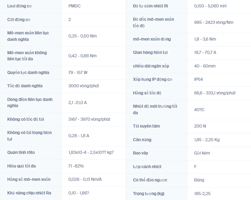 Ba điện áp khác nhau có sẵn trong phạm vi: 12V, 24V và 48V. Với chiều dài ống khói là 40 mm hoặc 60 mm và chiều dài động cơ tổng thể là 125 mm hoặc 146 mm, động cơ hoạt động ở công suất 79 – 157 watt và tạo ra mô-men xoắn liên tục 0,25 – 0,5 Nm trên toàn phạm vi. đại lý maxon