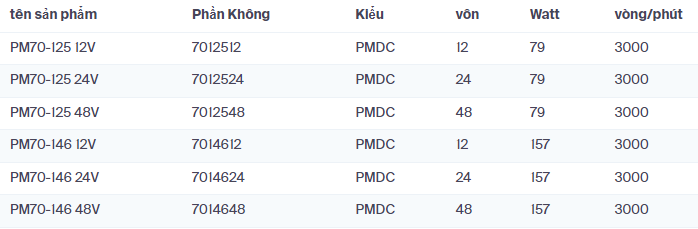 Dòng sản phẩm PM70 của chúng tôi bao gồm các động cơ dòng điện một chiều nam châm vĩnh cửu (PMDC). Chúng có nhiều mức điện áp từ 12V – 48V và có công suất đầu ra từ 79 – 157 Watts.