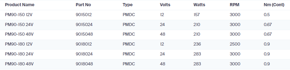Động cơ nam châm vĩnh cửu PM90 Maxon là động cơ sử dụng dòng điện một chiều nam châm vĩnh cửu (PMDC). Nó hoạt động trong khoảng 12 – 48 volt và có công suất đầu ra 157 – 283 Watts. Nó được đánh giá ở mức 0,5 – 0,9 Nm (S1) cho mô-men xoắn liên tục và mô-men xoắn gián đoạn tối đa là 1,17 – 1,5 Nm (S2 – 15 phút).