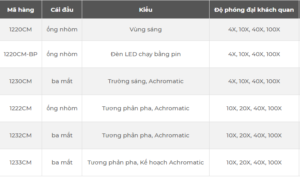 Tất cả các mẫu đều có thị kính 10X WideField, đèn halogen thạch anh biến đổi 20W, màng chắn trường để chiếu sáng Koehler và được bảo hành 5 năm.
