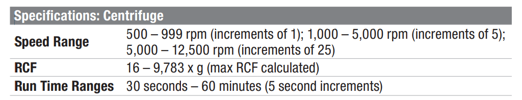 Bao gồm hai rôto: một rôto 12 vị trí cho ống 1,5/2,0 mL và một rôto 6 vị trí cho ống 5 mL; bộ chuyển đổi được bao gồm cho các ống 0,2 mL, 0,5 mL và 1,5 mL.