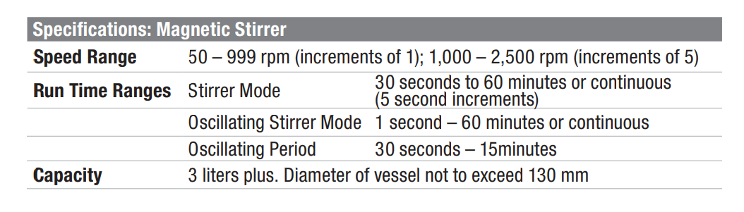 Khuấy lên tới 3 lít (đường kính tối đa 130 mm) với phạm vi tốc độ từ 50 đến 2500 vòng/phút; tốc độ có thể được điều chỉnh trong quá trình hoạt động.