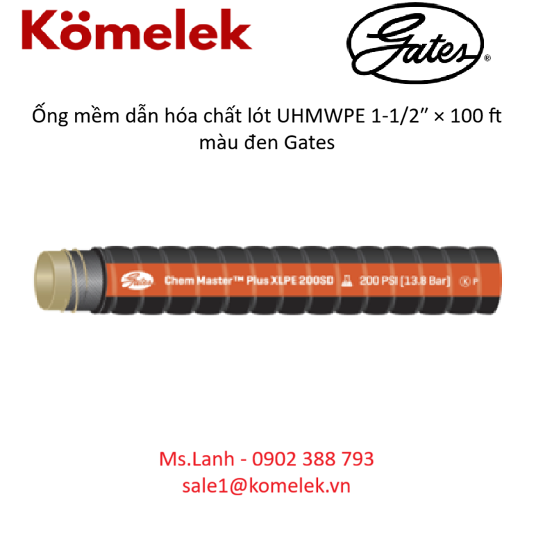 Ống mềm dẫn hóa chất lót UHMWPE 1-1/2″ × 100 ft (màu đen) là dòng ống công nghiệp chuyên dụng của Gates, được thiết kế để vận chuyển hóa chất, dung môi và chất lỏng ăn mòn trong các hệ thống công nghiệp yêu cầu cao về độ bền, an toàn và tuổi thọ.