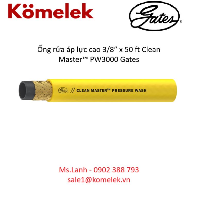 Ống rửa áp lực cao 3/8″ x 50 ft Clean Master™ PW3000 là ống cao áp chất lượng cho máy xịt rửa công nghiệp, chịu áp lực đến 3000 psi, dùng với nước nóng/lạnh, lõi thép gia cường, vỏ bọc bền môi trường nặng, màu vàng dễ quan sát trong thi công.