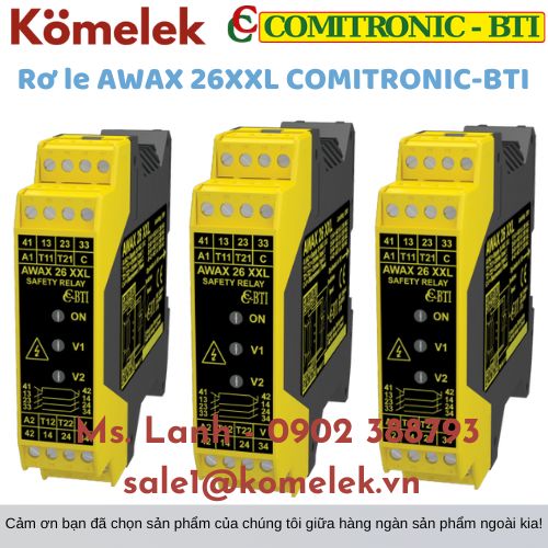 Rơ le AWAX 26XXL COMITRONIC-BTI dùng để điều khiển cảm biến quy trình Acotom, công tắc cơ học, dừng khẩn cấp tiếp điểm đầu ra 8A/250V, kiểm tra chống dính của nút đặt lại, điều khiển ngắn mạch “DLC” cực nhanh: phát hiện ngắn mạch trong 2 micro giây và tự đặt lại, quản lý bảo mật trong kiểu dáng nhỏ gọn 22,5 mm, mức hiệu suất với bộ điều khiển AWAX: PL = e loại bảo mật: 4 cấp độ ‘không an toàn’: SIL 3. Nguồn điện: 24VDC.
