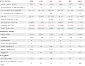 Việc làm mát hiệu quả từ Súng hơi lạnh có thể loại bỏ sự phát triển của các bộ phận liên quan đến nhiệt đồng thời cải thiện khả năng chịu đựng của các bộ phận và chất lượng hoàn thiện bề mặt. Súng hơi lạnh có cài đặt nhiệt độ và lưu lượng có thể điều chỉnh; và một số kiểu máy có vòi phun không đóng băng để loại bỏ sự lộn xộn do sương giá và ngưng tụ.